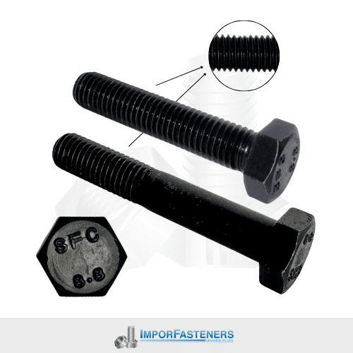 Perno cabeza hexagonal según norma DIN 933, fabricado con acero de carbono, templado y revenido. Ofrece alta resistencia mecánica y es ideal para aplicaciones estructurales, maquinaria, construcciones metálicas e instalaciones industriales que requieren fijaciones seguras y duraderas.