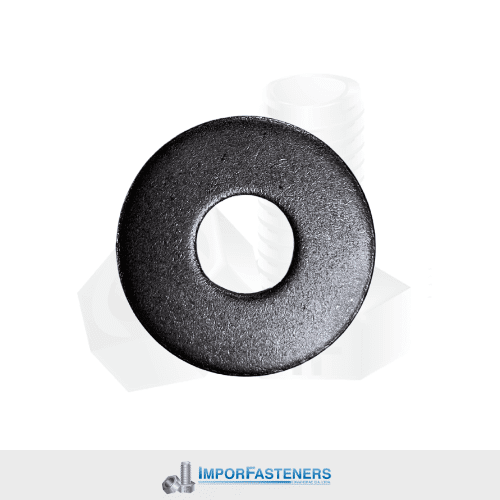 Rodela plana, diseñada para distribuir la carga de sujeción y proteger superficies en uniones con pernos o tornillos. Disponible en acabados negro (natural) o zincado, según las necesidades de protección contra la corrosión.