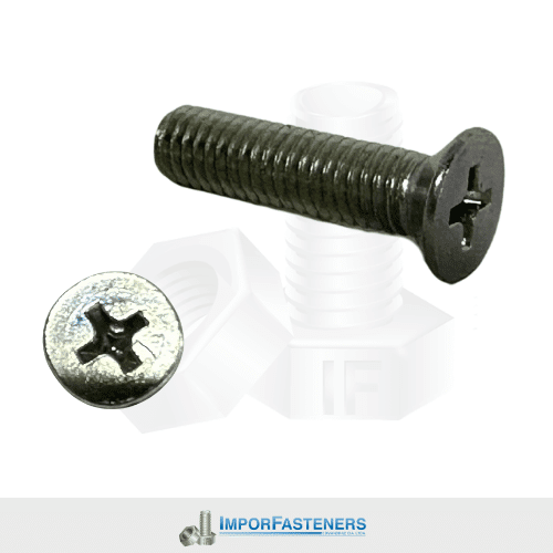 Tornillo con cabeza avellanada tipo Philips, diseñado para quedar al ras en aplicaciones de madera o metal ligero.