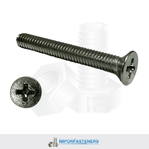 Tornillo con cabeza avellanada tipo Philips, diseñado para quedar al ras en aplicaciones de madera o metal ligero.