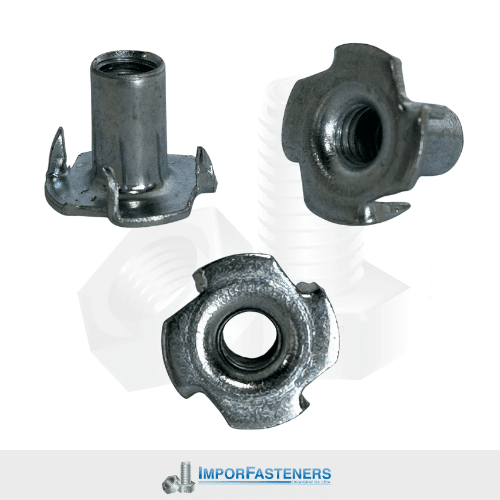 Tuerca tipo Tee con púas, diseñada para incrustarse en madera o superficies blandas. Permite fijaciones firmes desde el exterior.