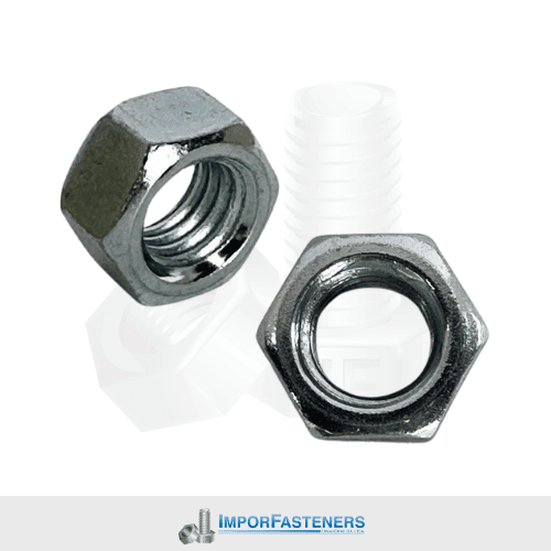 Tuerca hexagonal estándar fabricada en acero SAE con rosca UNC. Ideal para uniones mecánicas generales.